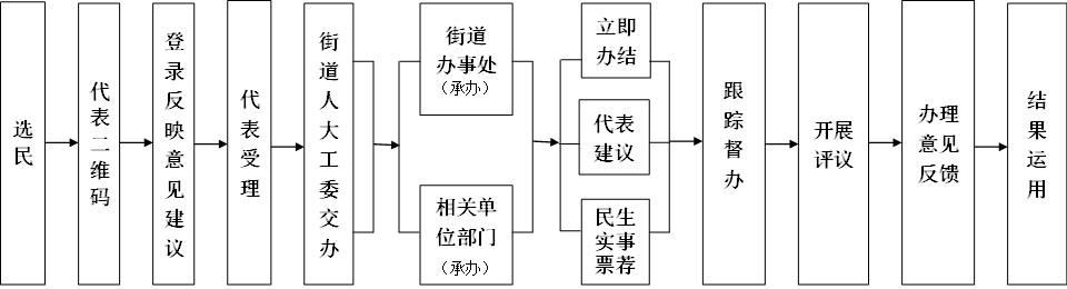 区人大常委会以强化基层民主监督为主线,以科学高效的“微建议”办理机制,多措并举保障选民诉求办理的快捷化、精准化和流程化。选民“扫码”反映诉求后,代表第一时间受理,将群众反映的问题以“微建议”交给街道人大工委,街道人大工委经过调研后迅速落实责任主体,街道能办结的由街道办事处负责,涉及区级部门权限的,由街道办事处会同相关部门进行联办,对涉及多个单位部门的复杂问题,由街道办事处牵头,采取会办方式协调解决。对办理周期较长、办理难度较大的重点问题,人大代表经过周密调研后形成闭会期间代表建议,由区人大常委会交给区政府办理。在办理过程中,人大代表及选民代表全程参与民主协商、民主讨论,提出意见和建议。街道人大工委运用微视察、微调研、代表约见、专题询问等多种叠加监督手段进行跟踪监督,形成“交办—办理—督办”的监督“链条”,推动群众所需所求得到解决(见下图)。