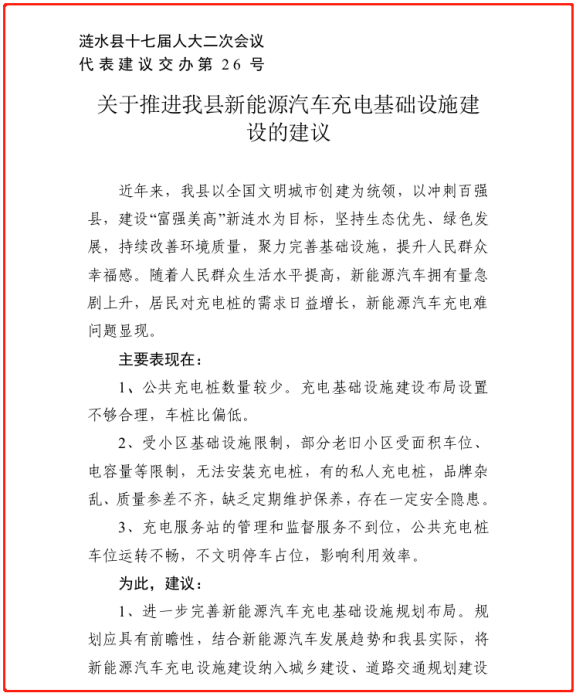 此外,她还关注到新能源汽车普及后群众“充电难”的新需求,提出了《关于推进我县新能源汽车充电基础设施建设的建议》,从“科学规划充电设施布局”“完善奖补机制吸引社会资本”“推进老旧小区充电改造”等方面给出建议,让民生“小事”也能得到精准回应。
