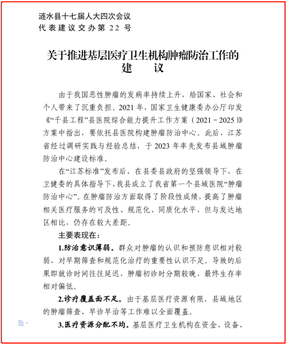 在肿瘤防治领域,她提出了《关于推进基层医疗卫生机构肿瘤防治工作的建议》。针对群众防治意识薄弱、基层筛查覆盖面不足、专业人才短缺等问题,建议“加强肿瘤知识科普宣传引导早期筛查”“依托省级三级医院资源联动提升县域诊疗能力”“建立肿瘤防治人才梯队培养机制”,为筑牢基层肿瘤防治防线贡献思路。