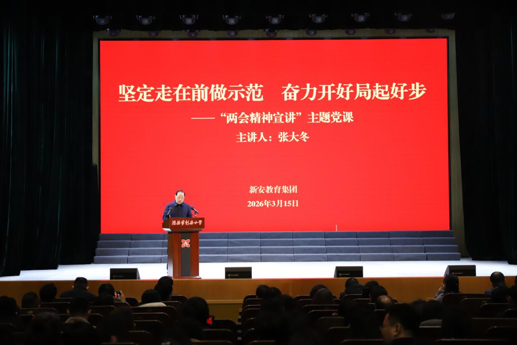3月15日,全国人大代表、新安教育集团党委书记张大冬为集团全体党员和教干宣讲全国“两会”精神。