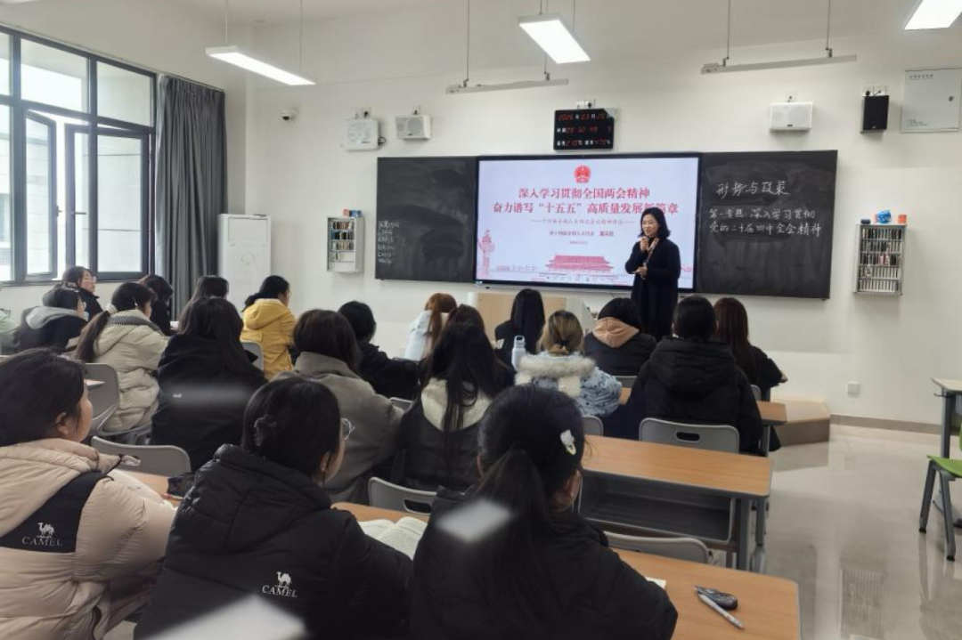 课堂上,莫元花结合自己现场聆听政府工作报告和审议“十五五”规划《纲要》的切身体会,用通俗的语言和生动的案例,向同学们传达了国家在推动新质生产力发展、传统产业转型升级、职业教育发展以及乡村振兴等方面的政策导向。从财政支持高科技项目、设备更新改造,到智能制造、新能源汽车等未来产业布局;从“多劳者多得、技高者多得”的技能人才激励政策,到非遗活化、产业富民的实践路径,莫元花将国家发展的大逻辑与产业发展的新趋势娓娓道来。