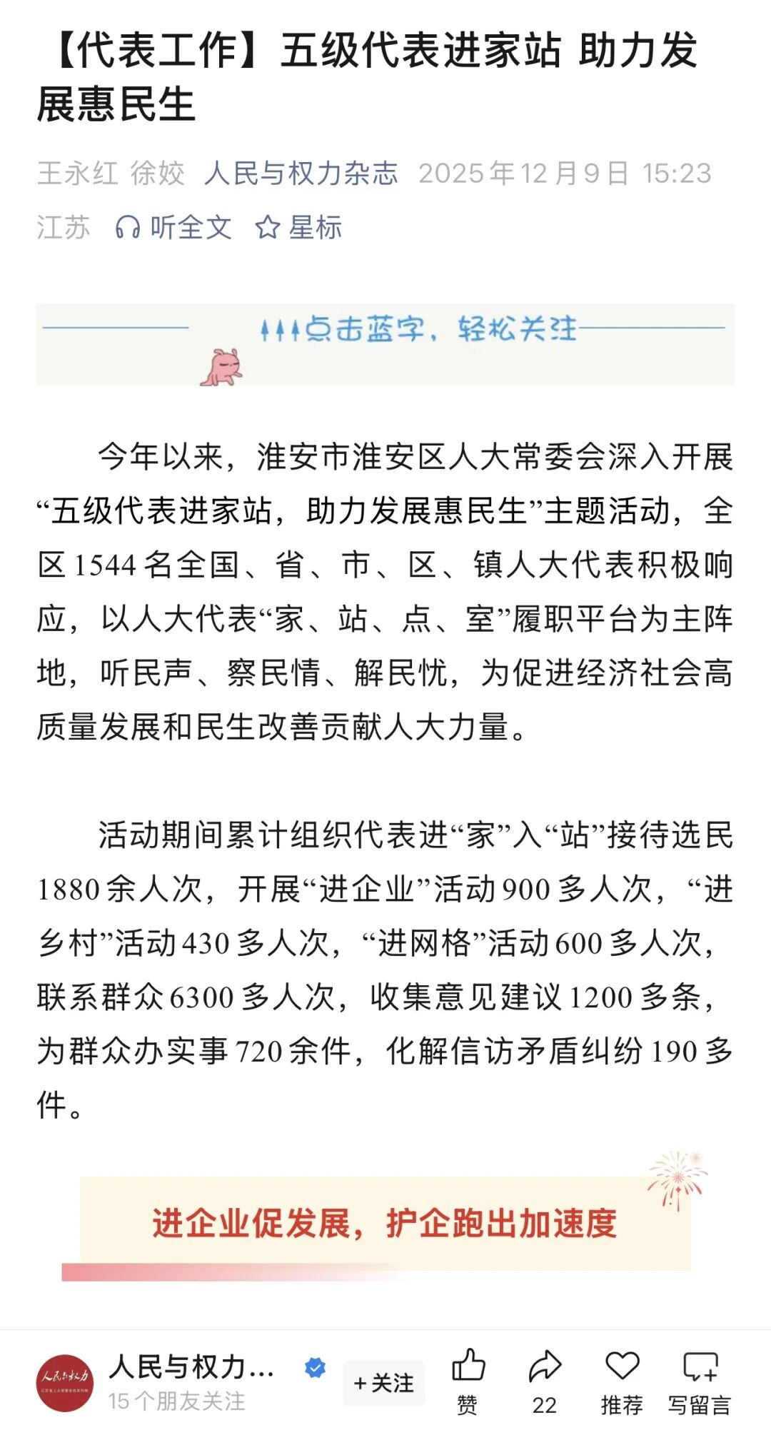 今年以来,淮安市淮安区人大常委会深入开展“五级代表进家站,助力发展惠民生”主题活动,全区1544名全国、省、市、区、镇人大代表积极响应,以人大代表“家、站、点、室”履职平台为主阵地,听民声、察民情、解民忧,为促进经济社会高质量发展和民生改善贡献人大力量。