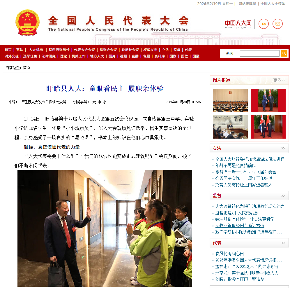 2026年2月9日,全国人大官方网站刊发《盱眙县人大:童眼看民主 履职亲体验》。