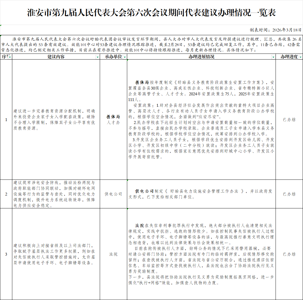 盱眙县人大常委会立即行动,对会上57名代表审议时的发言进行记录、筛选、提炼,最后形成涵盖26名代表、涉及30个承办单位的53条建议清单,充分认识到审议发言中蕴含的价值,让每一个合理建议都有机会转化为实际行动,开启了代表建议转化工作的创新篇章。