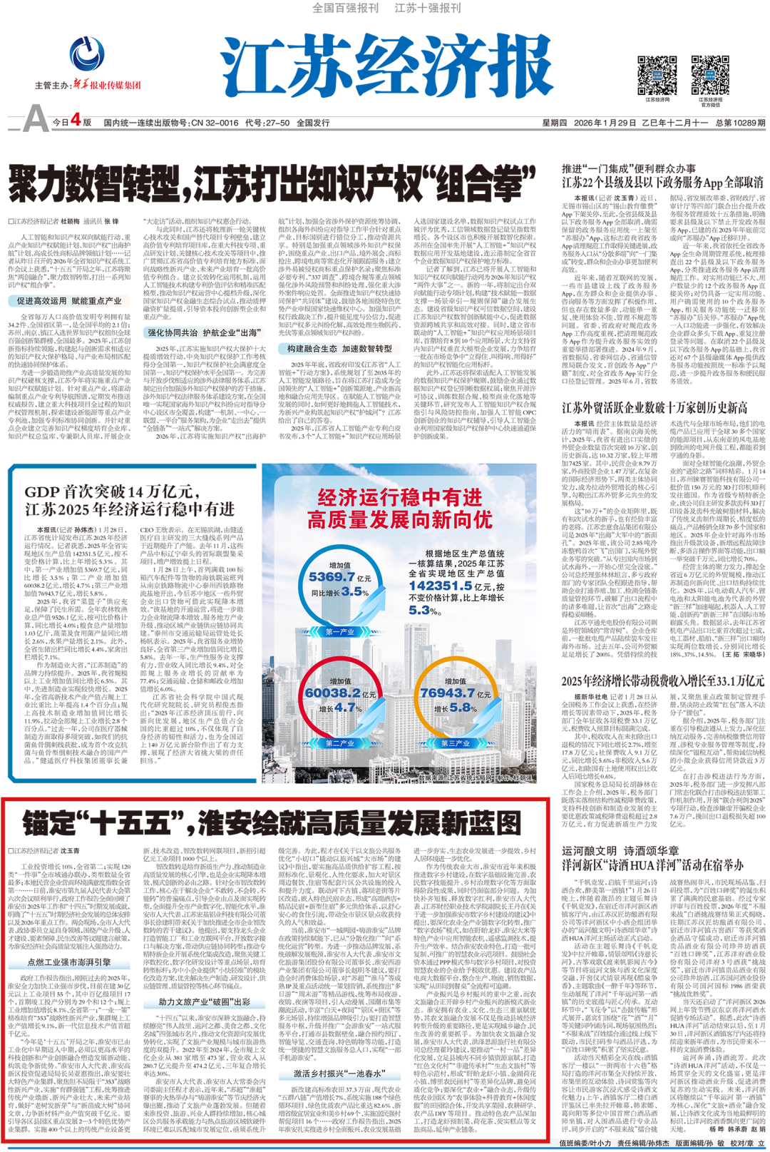 2026年1月29日《江苏经济报》刊发了《锚定“十五五”,淮安绘就高质量发展新蓝图》。正文如下: