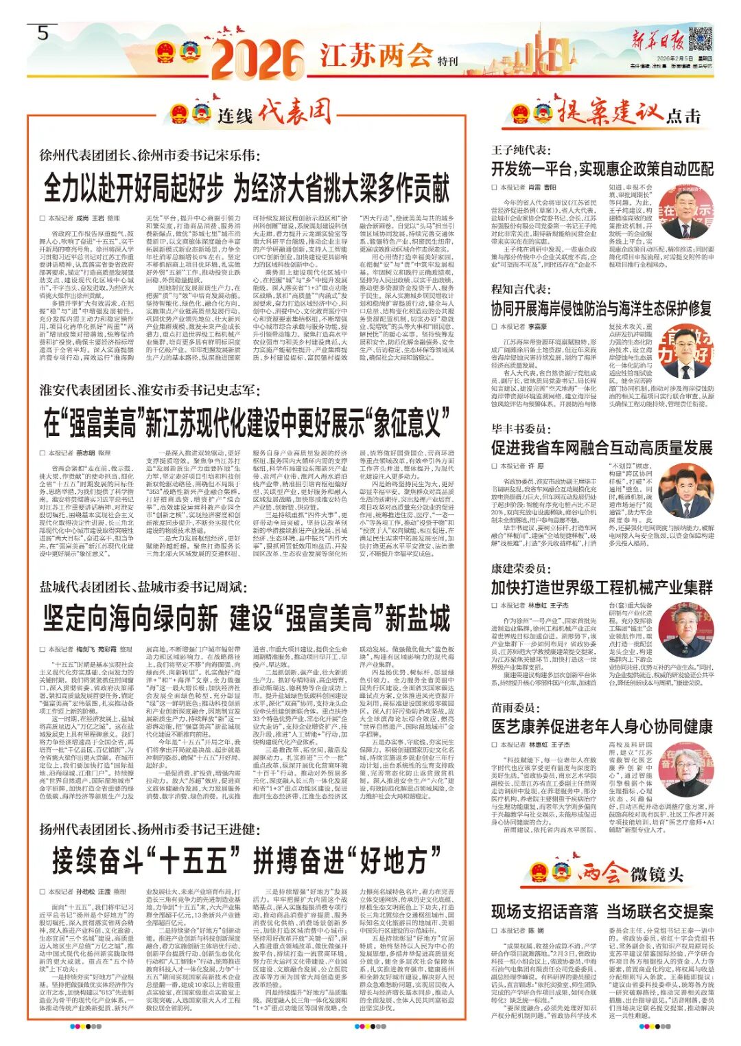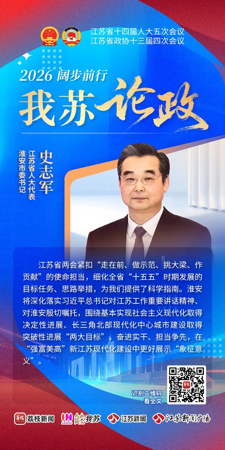 省两会紧扣“走在前、做示范、挑大梁、作贡献”的使命担当,细化全省“十五五”时期发展的目标任务、思路举措,为我们提供了科学指南。淮安将贯彻落实习近平总书记对江苏工作重要讲话精神、对淮安殷切嘱托,围绕基本实现社会主义现代化取得决定性进展、长三角北部现代化中心城市建设取得突破性进展“两大目标”,奋进实干、担当争先,在“强富美高”新江苏现代化建设中更好展示“象征意义”。