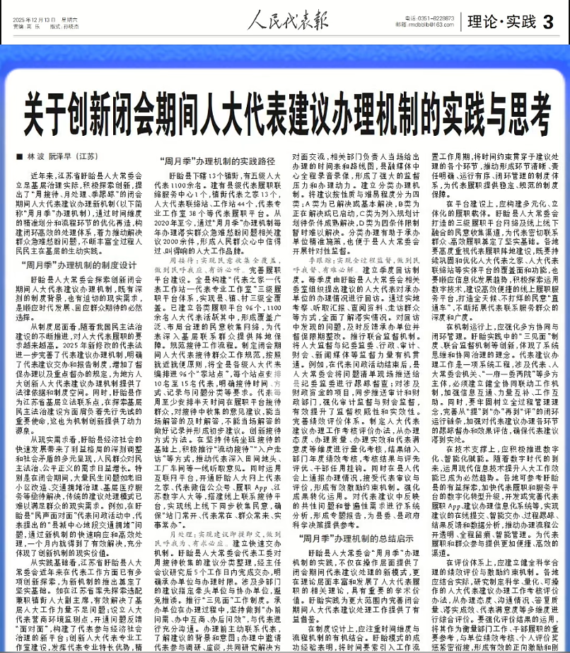 12月13日,《人民代表报》刊发了《关于创新闭会期间人大代表建议办理工作机制的实践与思考》。正文如下: