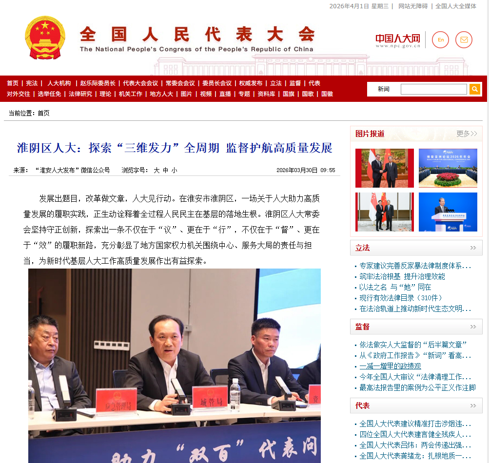 2026年3月30日,全国人大官方网站刊发《淮阴区人大:探索“三维发力”全周期 监督护航高质量发展》。